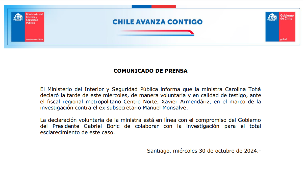 Este miércoles por la tarde, el Ministerio del Interior y Seguridad Pública comunicó que la ministra Carolina Tohá declaró ante el fiscal regional metropolitano Centro Norte, Xavier Armendáriz, en el marco de la investigación contra el ex Subsecretario Manuel Monsalve.