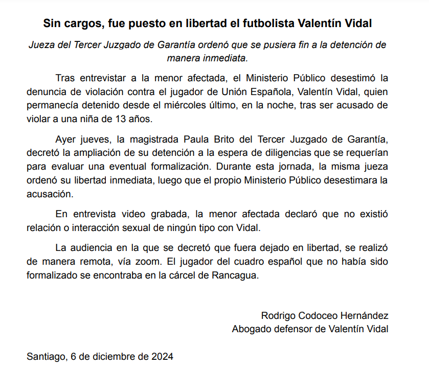 Debido a esto, Vidal fue dejado en libertad. Cabe recordar de que luego que la Fiscalía solicitara ampliar la detención por diligencias pendientes, el jugador fue enviado a la cárcel de Rancagua, donde estuvo casi 24 horas.