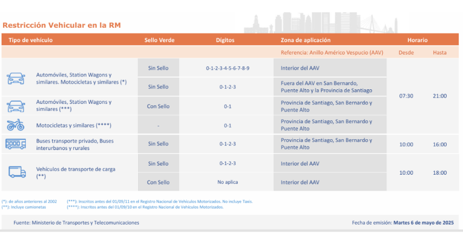La restricción vehicular se aplica de forma permanente de lunes a viernes y excluye los festivos. La restricción afecta a vehículos con y sin Sello Verde, y varía según zonas y horarios, explicó el Ministerio de Transportes y Telecomunicaciones.