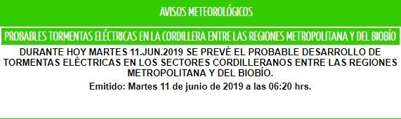 Pero este no fue el único. La mañana de este martes informó que podrían presentarse tormentas eléctricas en la cordillera, desde la región Metropolitana hasta el Biobío.