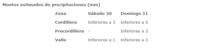 Lee también: Lluvias obligan a Aguas Andinas a declararse en alerta temprana preventivaEn cuanto al pronóstico de lluvias, la autoridad entregó la estimación para los distintos sectores de la Región Metropolitana.