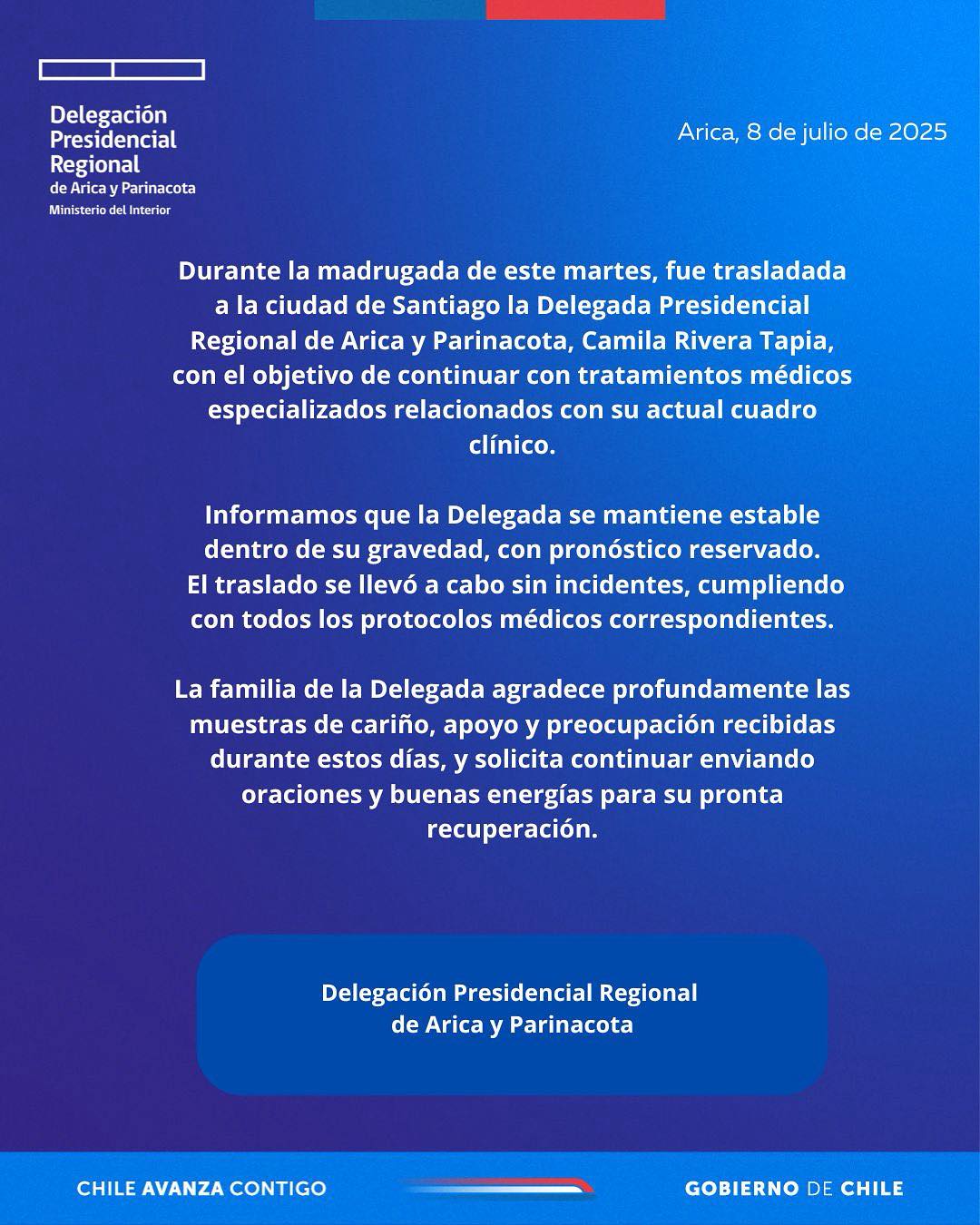A través de un comunicado, la Delegación Presidencial Regional de Arica y Parinacota, informó que Camila Rivera Tapia fue trasladada a Santiago con el objetivo de continuar con tratamientos médicos especializados relacionados con su actual cuadro clínico.