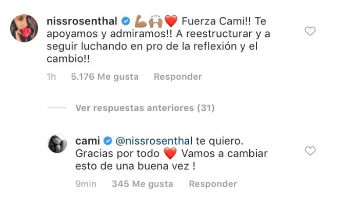 "Fuerza Cami!! Te apoyamos y admiramos!! A reestructurar y a seguir luchando en pro de la reflexión y el cambio!!", le comentó Denise Rosenthal a su colega nacional a través de su cuenta de Instagram.