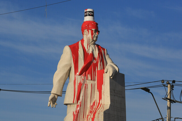 Según información preliminar, entregada por las autoridades, un grupo de tres personas lanzó pintura roja al monumento y escribió «asesino» y «ladrón» en la parte delantera de la estatua.