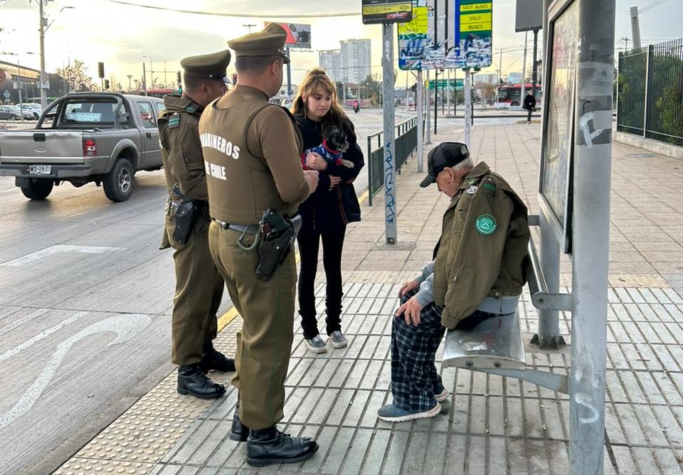 #LaFlorida: Carabineros ayudan a abuelito de 91 años que estaba desorientado en el centro de la comuna, facilitándole la chaqueta de uno de los funcionarios para abrigarlo debido a las bajas temperatura en la Región Metropolitana, llevándolo posteriormente a su domicilio.💚👴🏻 pic.twitter.com/c43KAgs6Yh