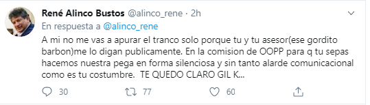 "A mi no me vas a apurar el tranco solo porque tu y tu asesor(ese gordito barbon)me lo digan publicamente. En la comision de OOPP para q tu sepas hacemos nuestra pega en forma silenciosa y sin tanto alarde comunicacional como es tu costumbre. TE QUEDO CLARO GIL K...", agregó Alinco.
