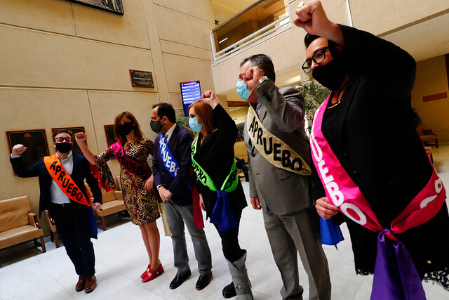 En la Cámara de Diputadas y Diputados, parlamentarios de oposición se sumaron ayer a su par Pamela Jiles (PH) y aparecieron en el recinto con bandas de colores por el Apruebo.