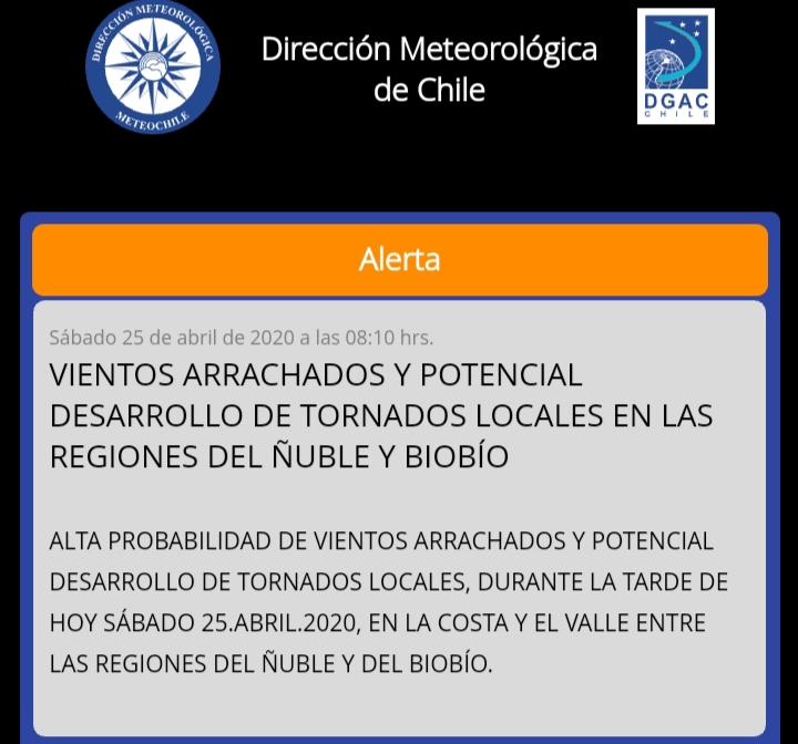 La Dirección Meteorológica de Chile emitió una alerta para este sábado 25 de abril por la ocurrencia de “vientos arrachados y potencial desarrollo de tornados locales en las regiones de Ñuble y Bío Bío”.