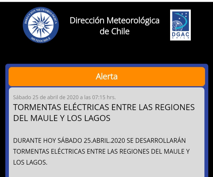 Además, la Dirección Meteorológica emitió una segunda alerta por la probabilidad de “tormentas eléctricas entre las regiones del Maule y Los Lagos durante este sábado 25 de abril”.