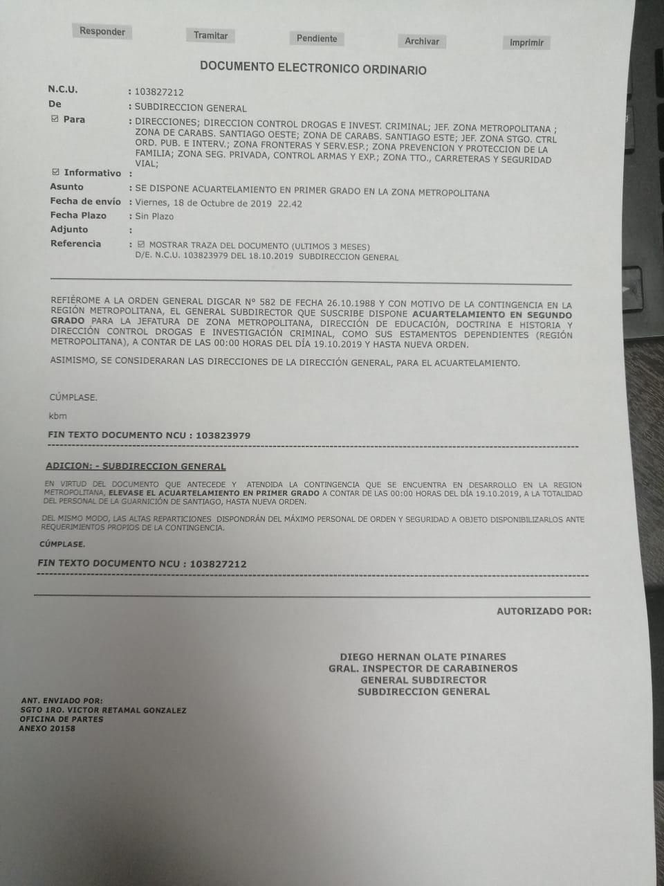 En el texto, firmado por el general inspector de Carabineros, Diego Hernán Olate Pinares, se especifica que "el general subdirector que suscribe dispone acuartelamiento en segundo grado para la jefatura de zona metropolitana".