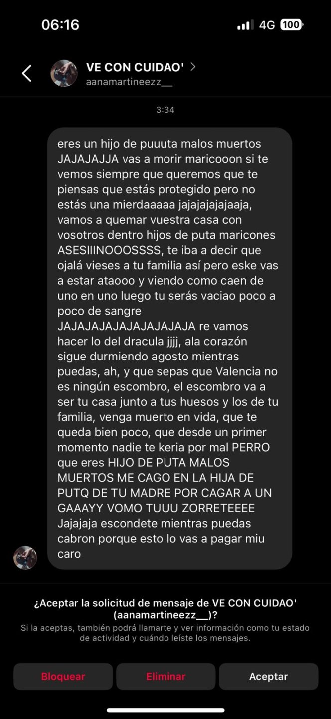 "Valencia no es ningún escombro, el escombro va a ser tu casa junto a tus huesos y los de tu familia. Venga muerto en vida, que te queda bien poco", dice parte del mensaje enviado por la cibernauta.