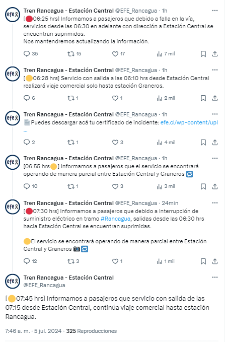 Posteriormente, desde EFE indicaron que la falla se debía a una interrupción en el suministro eléctrico en el tramo de Rancagua.