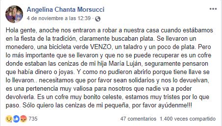 Una mujer de Mendoza (Argentina), llamada Angelina Chanta Morsucci, realizó un desesperado llamado en Facebook por una triste razón: un ladrón se llevó las cenizas de su hija.