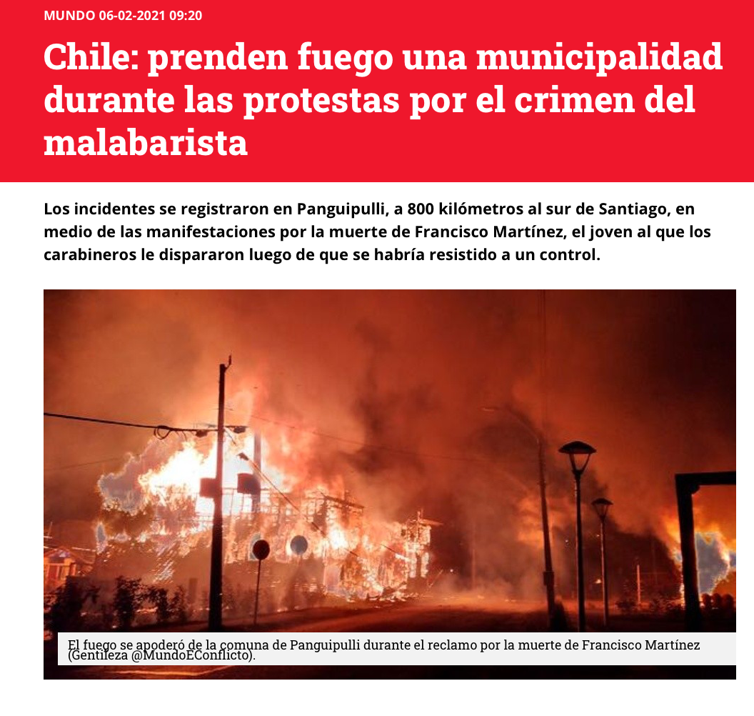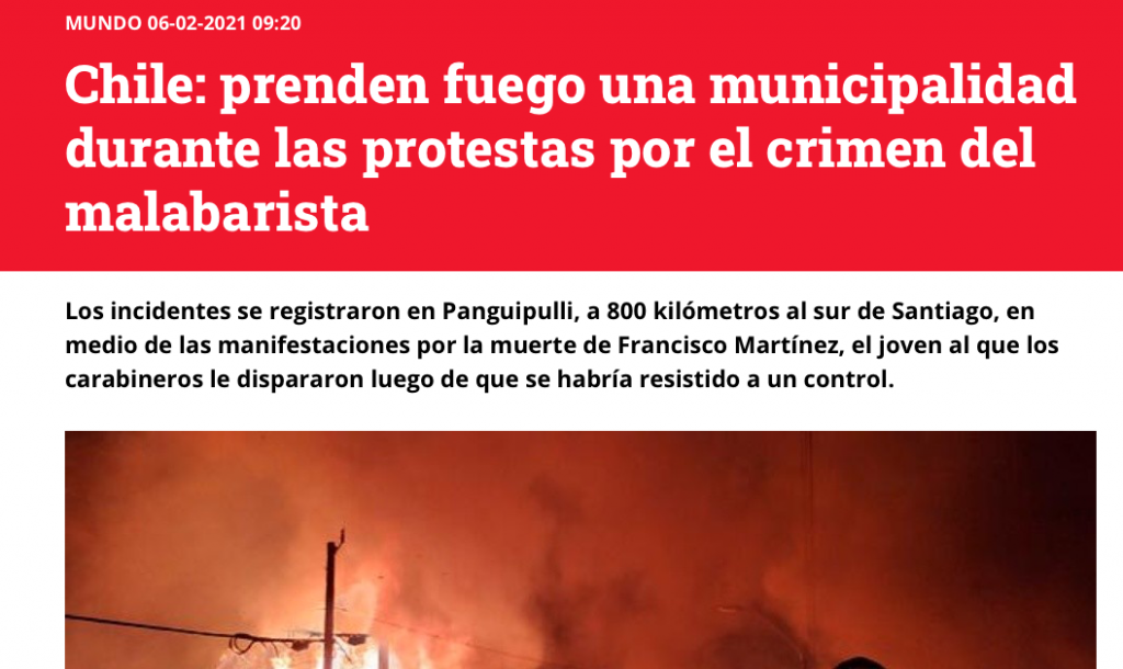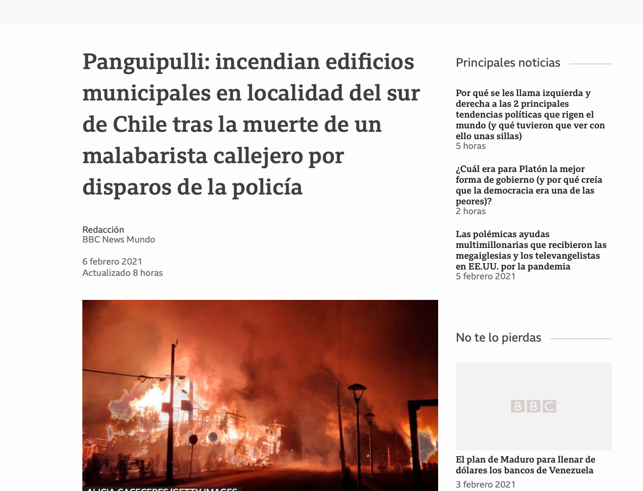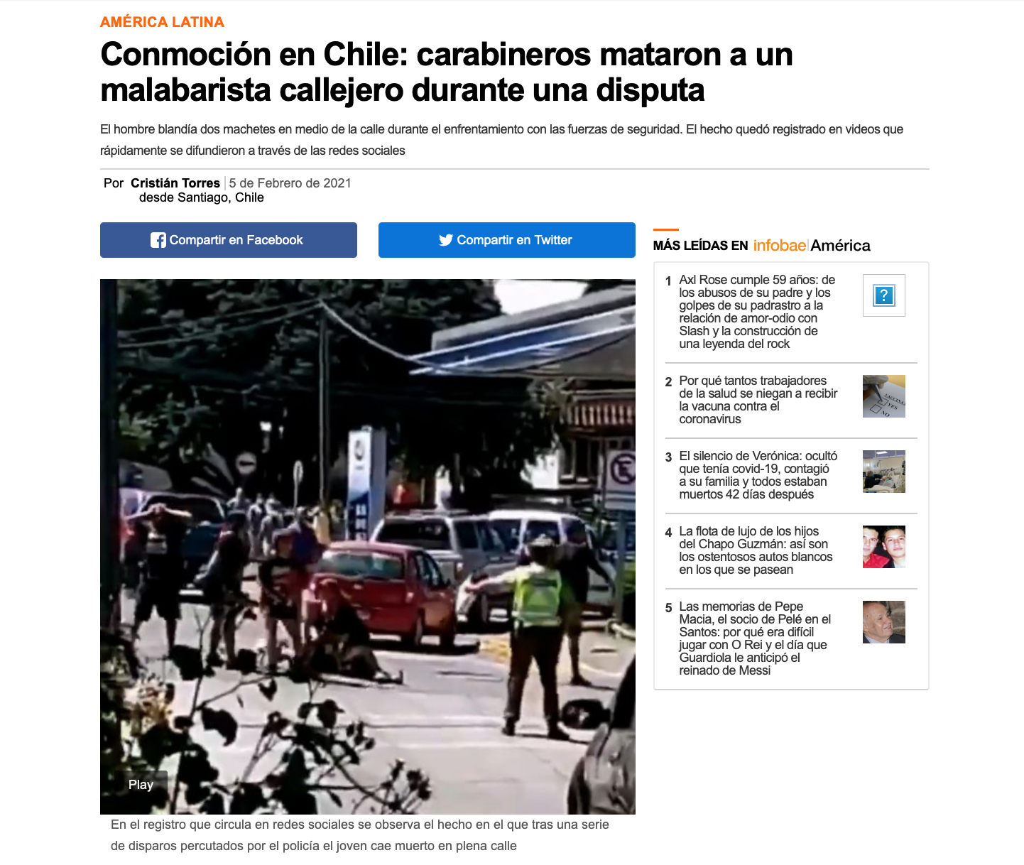 Lee también: Panguipulli: Municipalidad completamente destruida y otras 9 instituciones públicas quemadas tras incendiosMedios de Estados Unidos, Argentina, México, España y Perú, entre otros, han dado a conocer esta noticia, destacando el crimen y la posterior oleada de manifestaciones en repudio al actuar de los funcionarios de la institución.