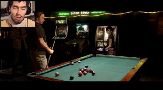 Avanzado el juego, la personaje Jodie se levanta y comienza a jugar pool. Uno de los otros personajes se acerca y se dispone a jugar junto a ella, a pesar de su negativa. Germán, por su parte, continúa comentando aquello que una mujer no debería hacer.