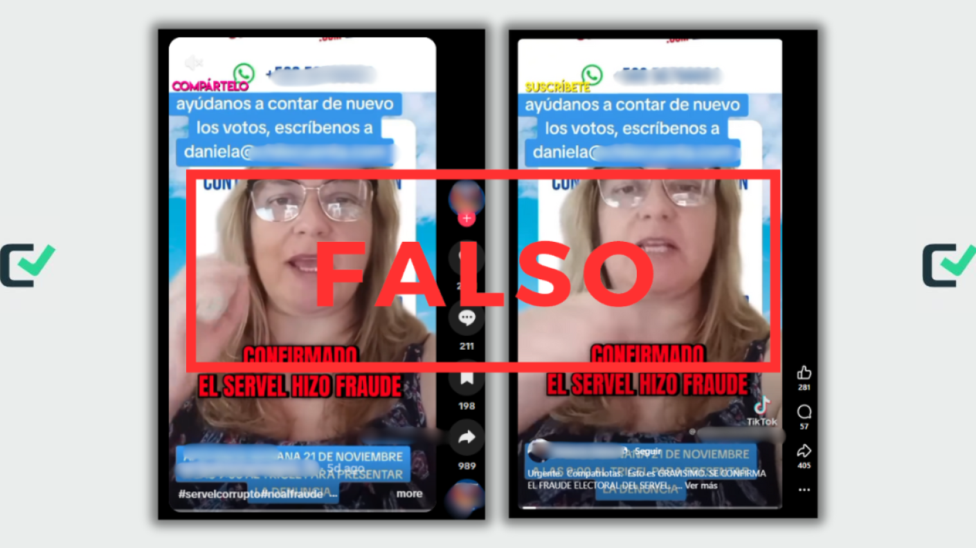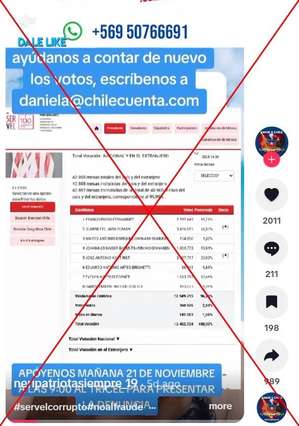 “Fraude en el SERVEL: Confirmado en las Elecciones 2025” o “Urgente. Compatriotas. Esto es GRAVISIMO. SE CONFIRMA EL FRAUDE ELECTORAL DEL SERVEL”, dicen los usuarios en Facebook y TikTok, junto con un video que explica supuestas actitudes fraudulentas del organismo electoral.
