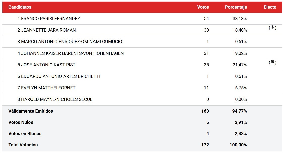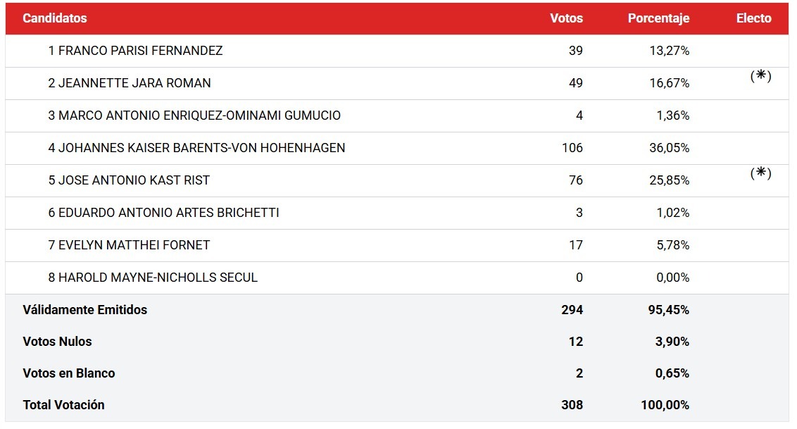 A pesar de que Kaiser fuera el ganador en esta mesa, Kast y Jara son los que aparecen marcados con un asterisco, ya que son estos dos los que ganaron a nivel nacional y se enfrentarán al balotaje.