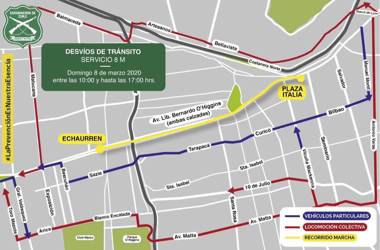 Carabineros informó que, en el marco de la marcha del 8M, se realizarán una serie de desvíos de tránsito en el centro de Santiago.