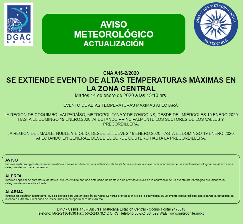 Este pronóstico coincide con el de la Dirección Meteorológica de Chile que emitió un aviso de altas temperaturas.