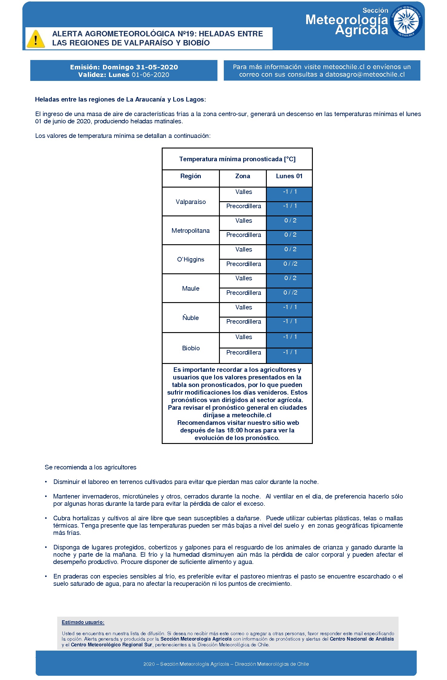 La Dirección Meteorológica de Chile emitió una alerta agrometeorológica por heladas para este lunes entre las regiones de Valparaíso y el Biobío.