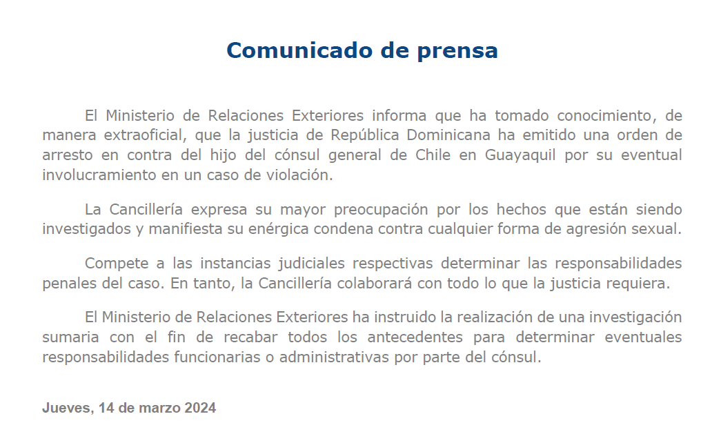 una orden de arresto en contra del hijo del cónsul general de Chile en Guayaquil por su eventual involucramiento en un caso de violación", dieron a conocer en un comunicado.