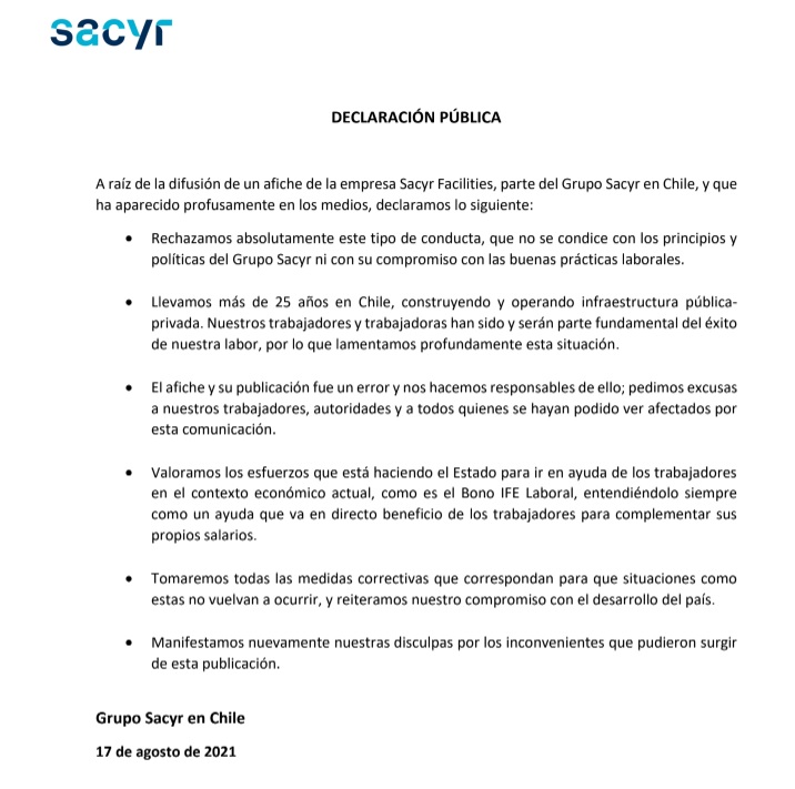 Por su parte, desde el Grupo Sacyr Chile, que incluye a la empresa Sacyr Facilities, emitieron un comunicado en el que se disculparon por lo acontecido, rechazando "este tipo de conducta, que no se condice con los principios y políticas del Grupo Sacyr ni con sus compromisos con las buenas prácticas laborales".