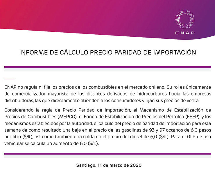 Lee también: Corte de Talca ordena a AFP Provida entregar a cotizante el total de sus fondos previsionalesENAP recalca además que no son ellos quienes fijan las tarifas de los combustibles en el mercado nacional, sino que su rol es "únicamente de comercializador mayorista de los distintos derivados de hidrocarburos hacia las empresas distribuidoras".