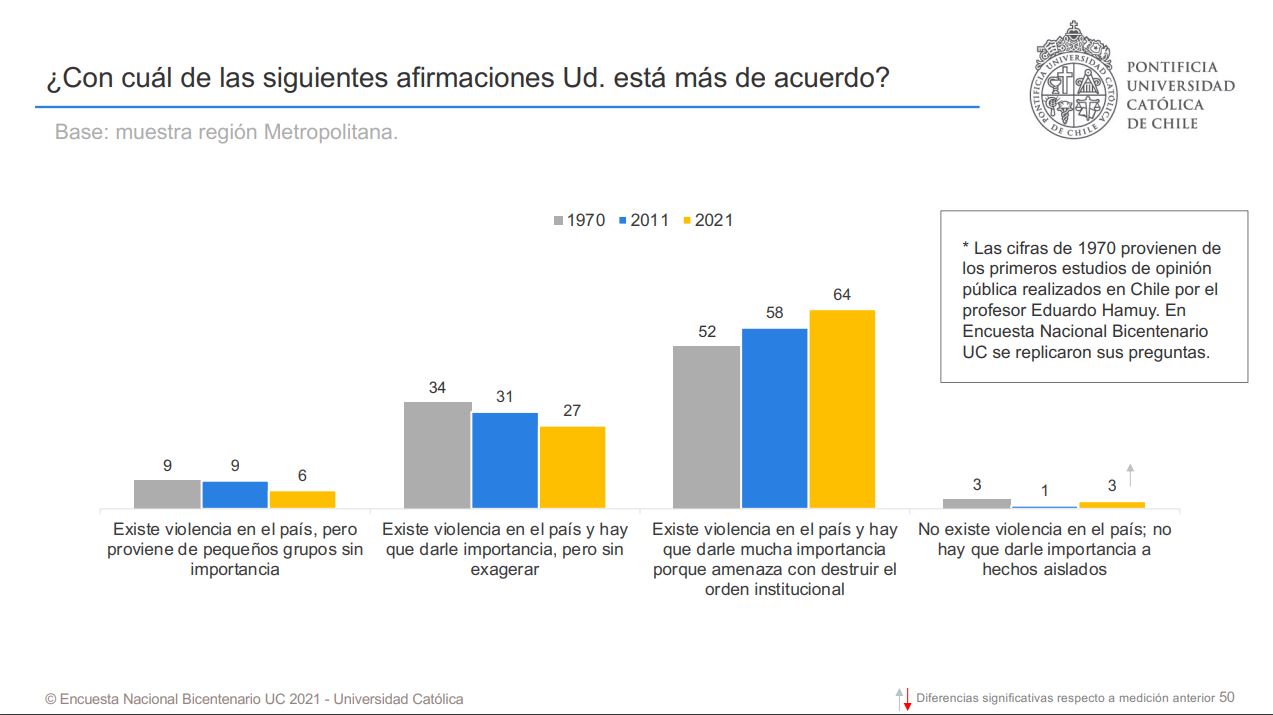 Asimismo, añadió que respecto a la percepción de violencia "es bien dramático que haya crecido tanto en poco tiempo, pero, en paralelo, hay otras preguntas que señalan que la aceptación de la violencia ha ido disminuyendo en el tiempo". Entonces, si bien el aumento en la violencia es notorio, la aceptación a la misma ha disminuido.