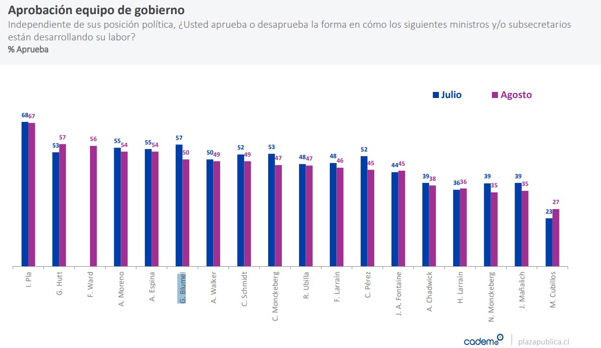 Otros miembros del equipo de Gobierno que tuvieron una caída considerable en su aprobación son el ministro de Vivienda, Cristián Monckeberg (de 53% a 47%) y el ministro secretario general de la Presidencia (Segpres), Gonzalo Blumel, quien bajó siete puntos porcentuales (de 57% a 50%).