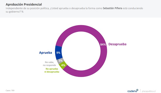 A la vez, su desaprobación tuvo un alza de dos puntos, alcanzando así un 84%. En tanto, un 4% de los encuestados indicó que no aprueba ni desaprueba su gestión, y otro 8% afirmó no saber.