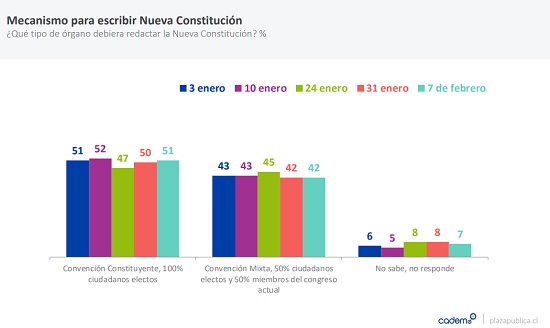 Sobre el tipo de órgano que debiera redactar la nueva Carta Fundamental, el 51% se mostró favorable a que sea vía Convención Constituyente (100% ciudadanos electos), mientras que el 42% prefiere que sea por Convención Mixta (50% ciudadanos electos y 50% miembros del congreso actual).