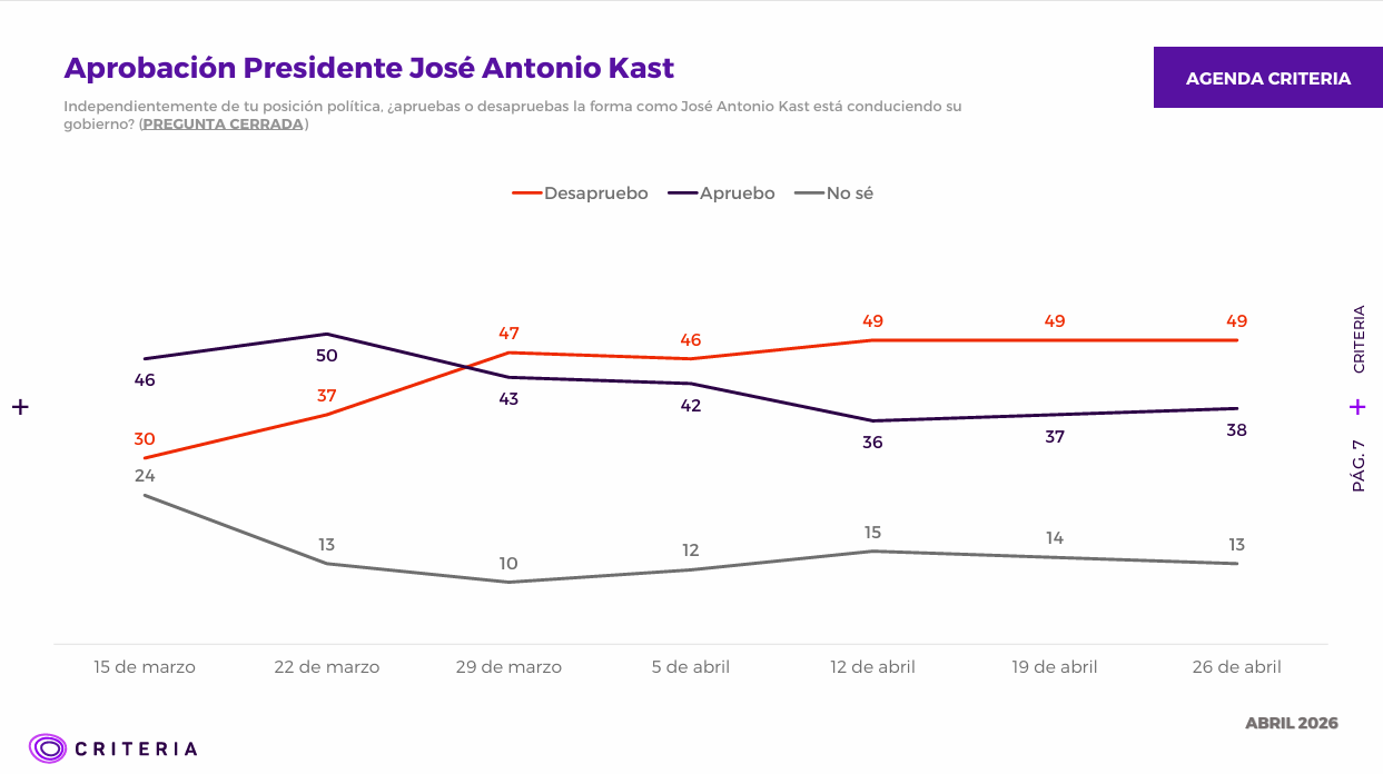 Encuesta Criteria: Aprobación del pdte. Kast registra leve aumento y desaprobación se mantiene en 49%