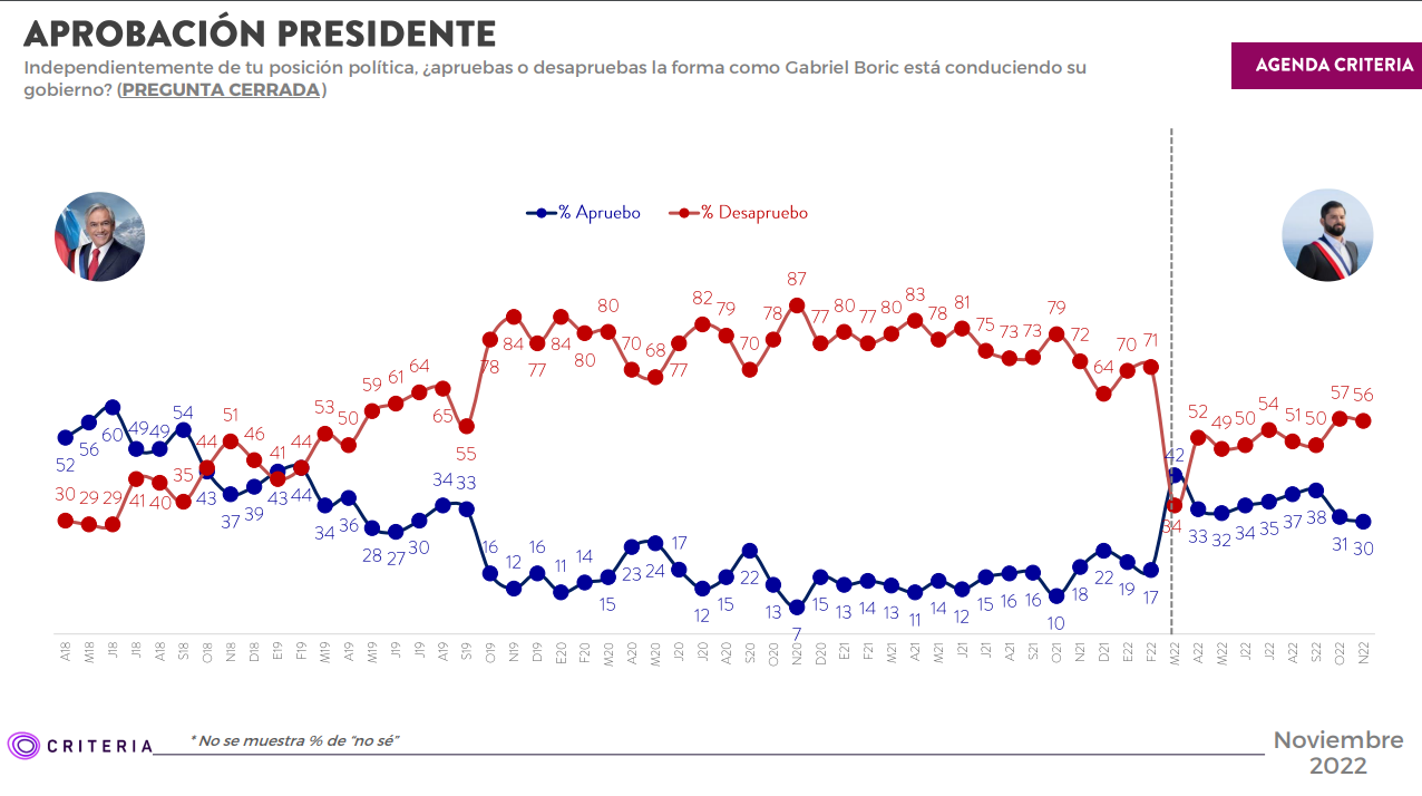 A su punto más bajo desde que asumiera el cargo llegó la aprobación del presidente Gabriel Boric, según reveló este jueves la encuesta Criteria.