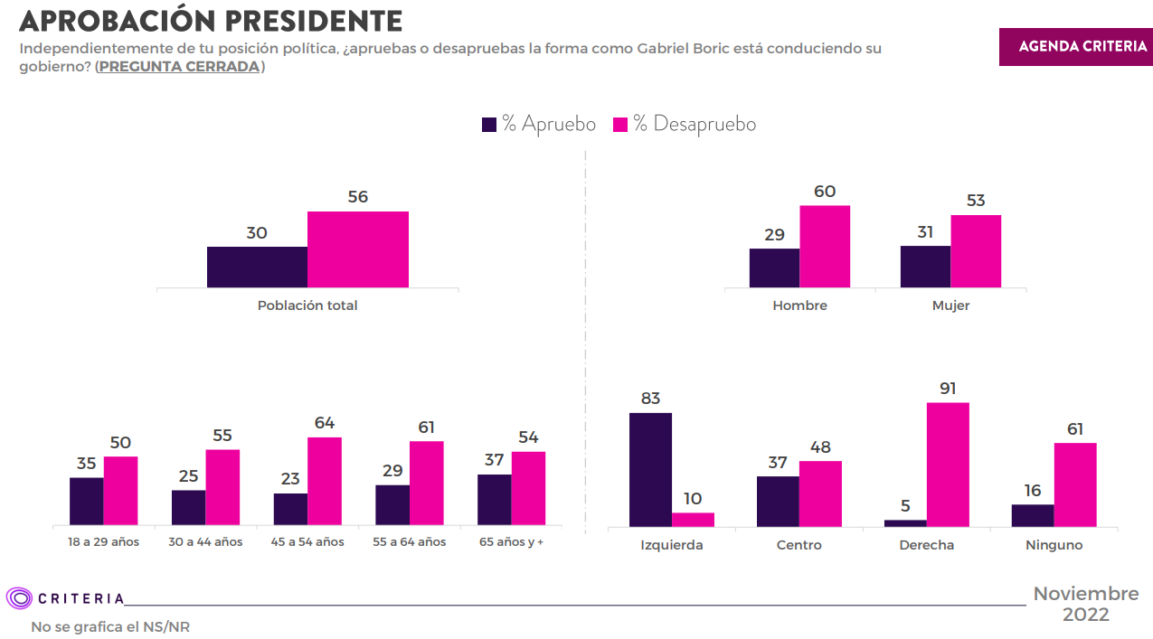 En ese sentido, el principal apoyo que recibe el presidente es de parte de las personas que se identifican con la izquierda (83%), porcentaje muy superior a quienes se sienten de centro (37%) o de derecha (5%).