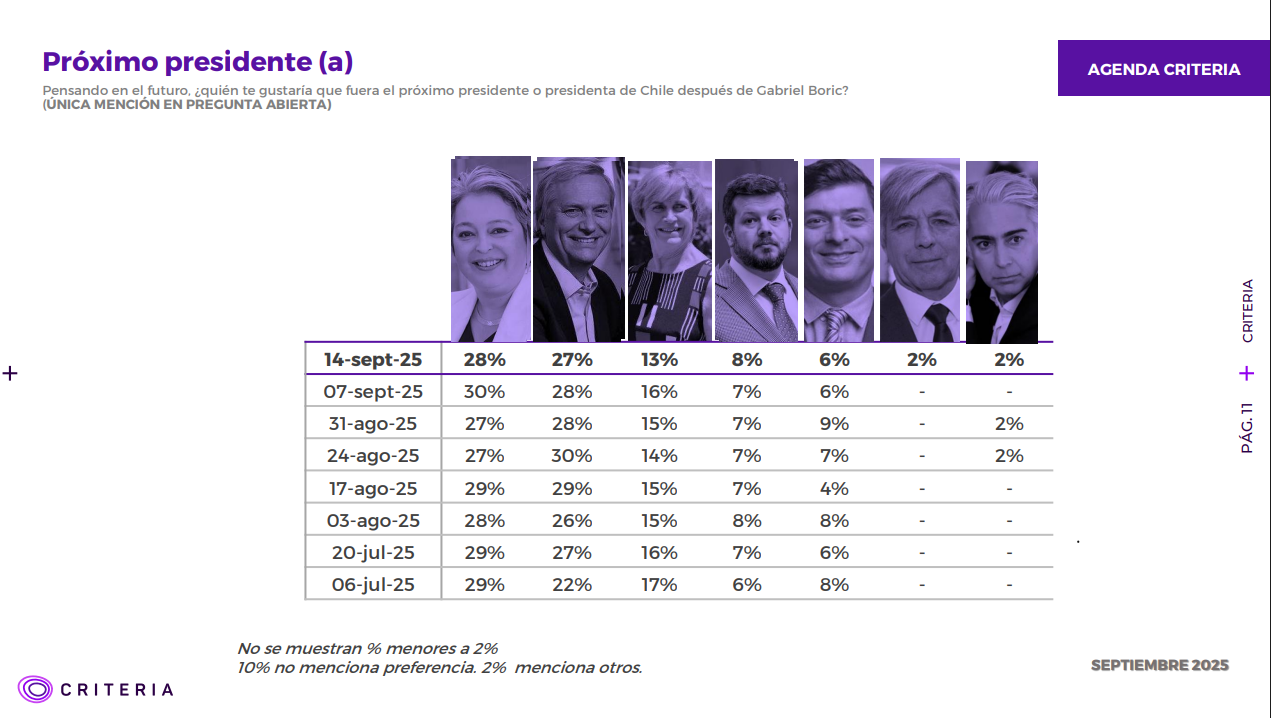En esta última edición, la candidata oficialista Jeannette Jara se mantiene en el primer lugar con un 28% de respaldo (-2). Muy cerca, la figura del partido Republicano, José Antonio Kast, alcanza un 27% (-1).