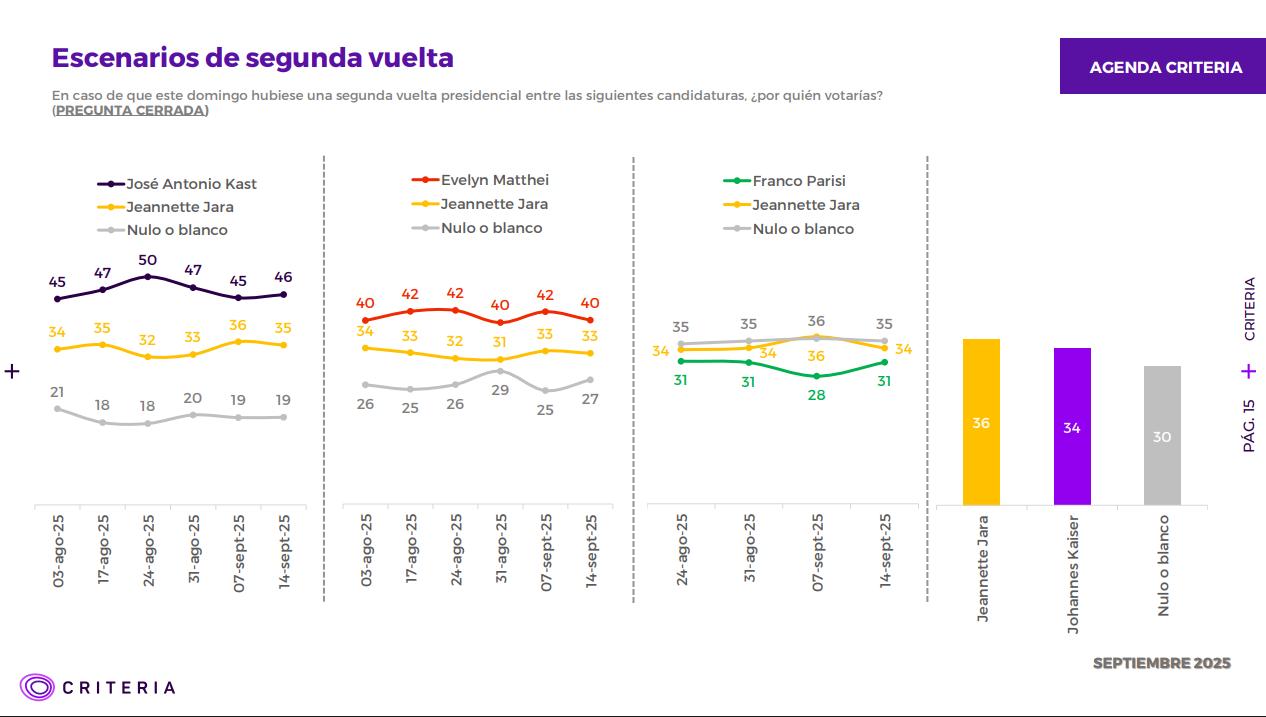 En un eventual balotaje entre Kast y Jara, el candidato republicano se impondría con un 46% (+1) frente al 35% (-1) de la candidata oficialista, mientras que un 19% votaría nulo o blanco.