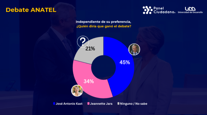 La última edición de la encuesta Panel Ciudadano de la Universidad del Desarrollo midió las repercusiones del debate presidencial de la Asociación Nacional de Televisión (Anatel), donde el pasado martes se vieron las caras Jeannette Jara y José Antonio Kast.