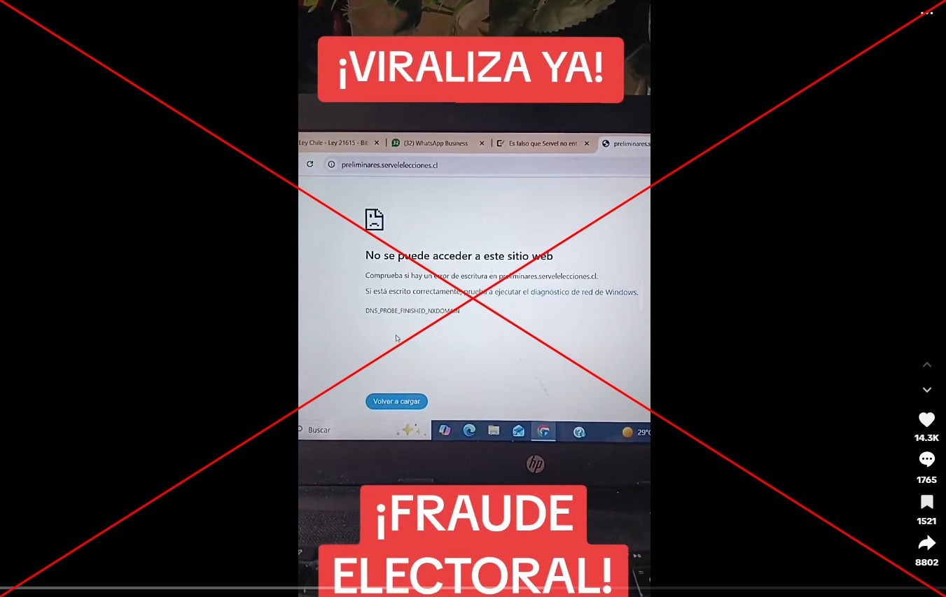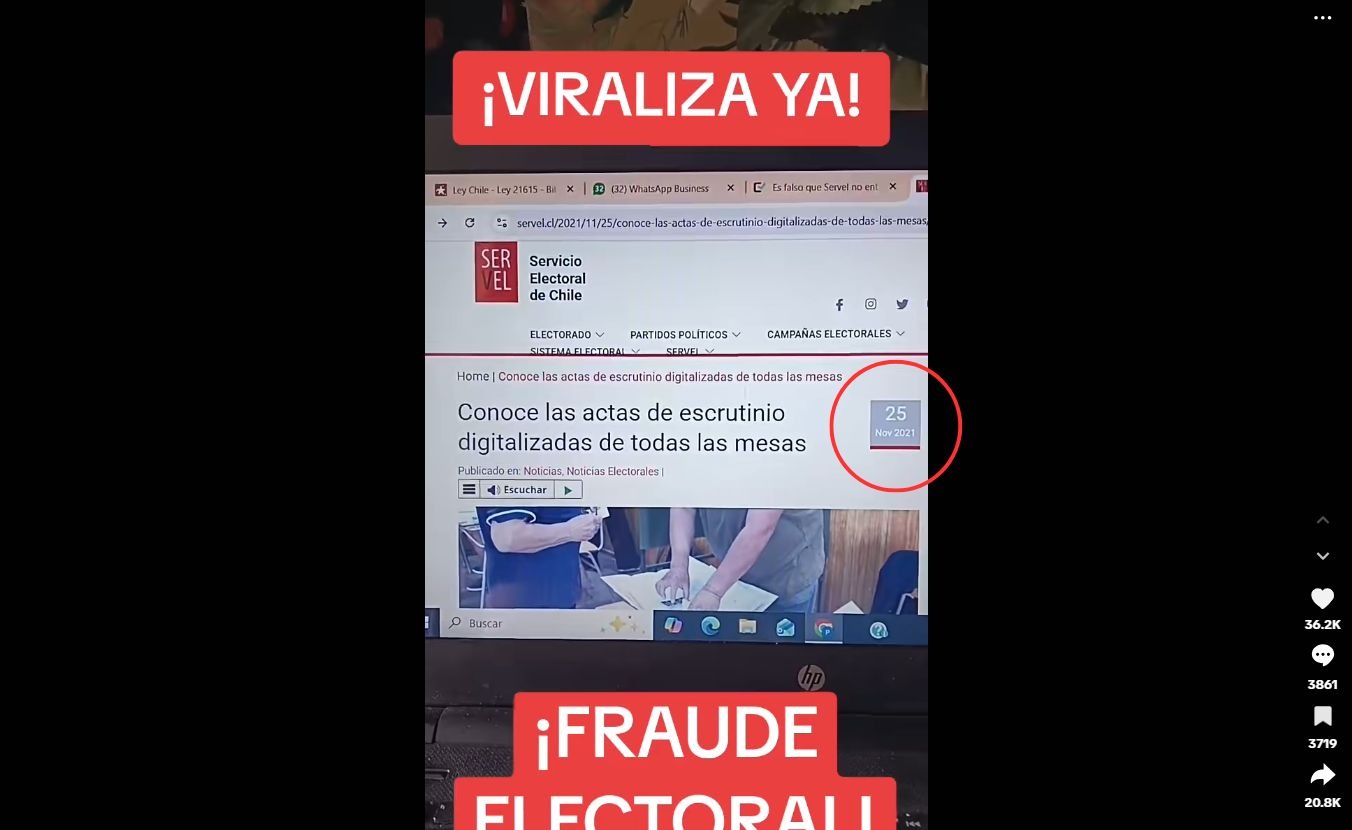 Ni los candidatos presidenciales chilenos ni el Servicio Electoral (Servel) han reportado incidentes de fraude durante los comicios del 16 de noviembre de 2025. Sin embargo, usuarios denuncian que el Servel “no ha subido a su página web” las actas de escrutinio, como determina la legislación. En un video, compartido más de 24.000 veces en redes sociales, se adjunta como prueba un enlace de las elecciones de 2021. Por otro lado, AFP corroboró que las actas de las últimas votaciones sí se encuentran en el sitio web del Servel.