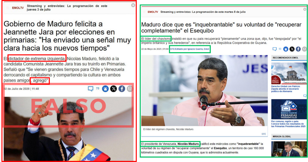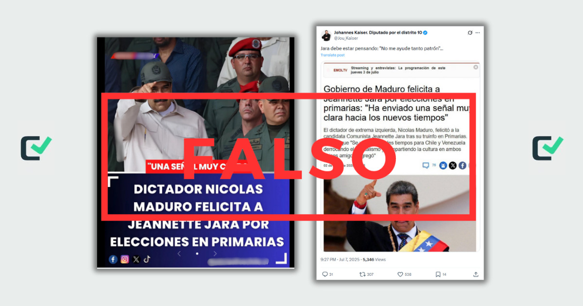 Usuarios en redes sociales han compartido a través de X (1, 2, 3, 4), Instagram (1, 2), Facebook (1, 2, 3, 4, 5, 6, 7) y TikTok (1, 2), diferentes supuestas gráficas de noticias que informan falsamente que el presidente de Venezuela, Nicolás Maduro, felicitó a la candidata oficialista a la Presidencia de Chile, Jeannette Jara, por su triunfo en las elecciones primarias del 29 de junio pasado.