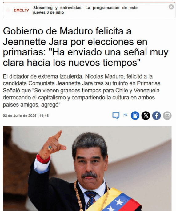 Incluso, el aspirante presidencial del Partido Nacional Libertario, Johannes Kaiser, publicó en su cuenta de X una captura de pantalla de un artículo supuestamente publicado el 2 de julio en el portal Emol, titulado: “Gobierno de Maduro felicita a Jeannette Jara por elecciones en primarias: ‘Ha enviado una señal muy clara hacia los nuevos tiempos’”.