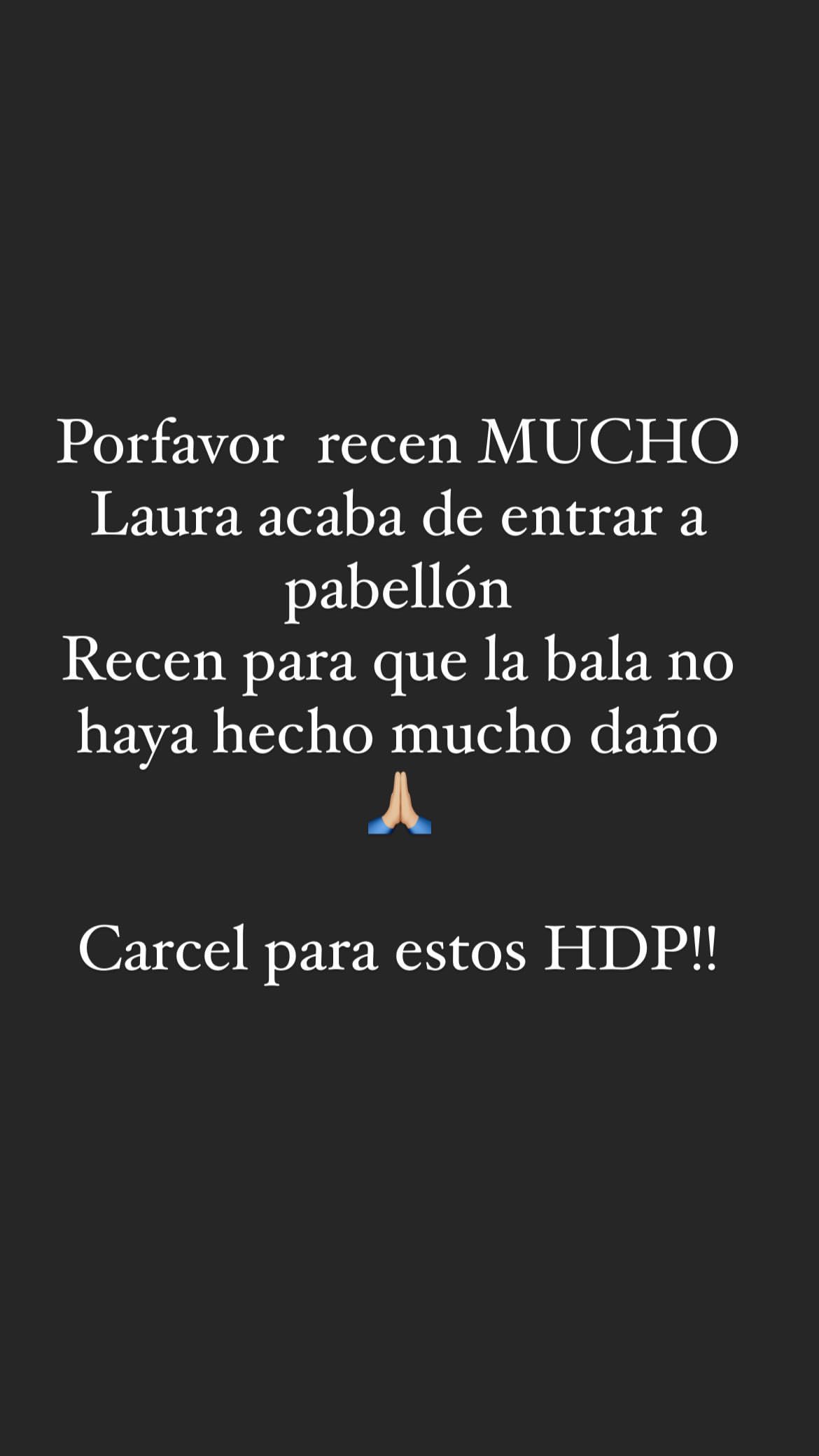 Lee también: La reflexión de Yuhui tras no llegar a la final de El Discípulo del Chef: "Lo importante es seguir luchando""Por favor, recen mucho. Laura acaba de entrar a pabellón. Recen para que la bala no haya hecho mucho daño", escribió Cristián de la Fuente durante la noche de este jueves.