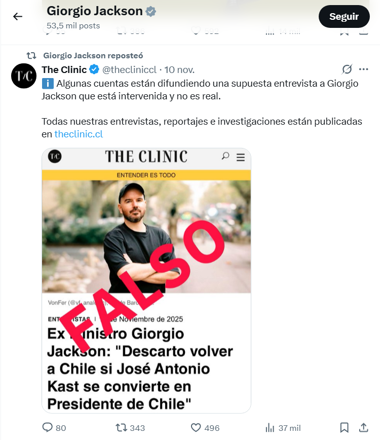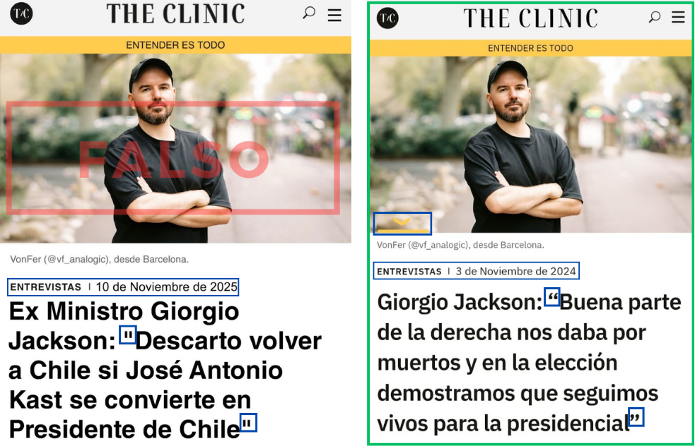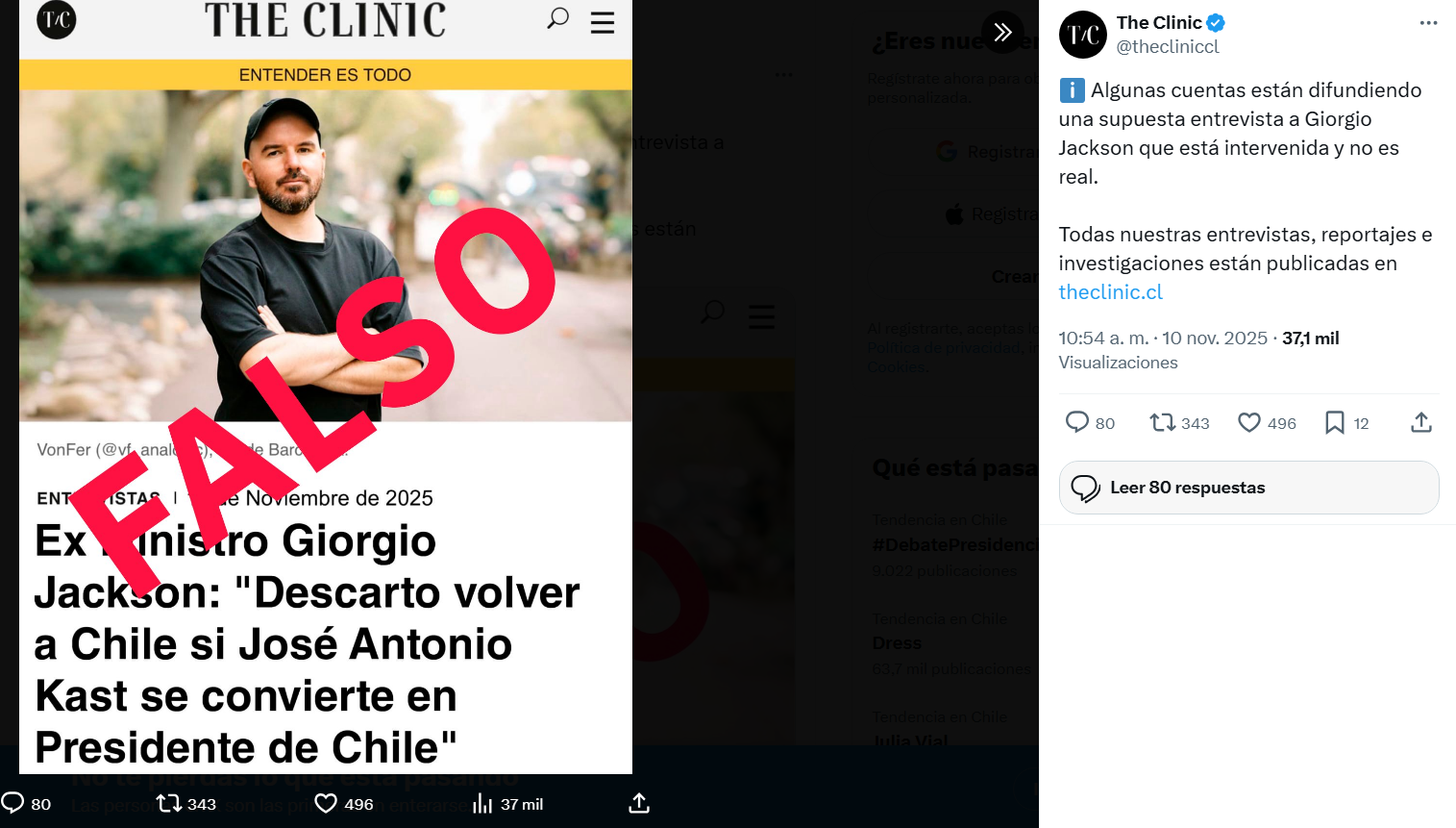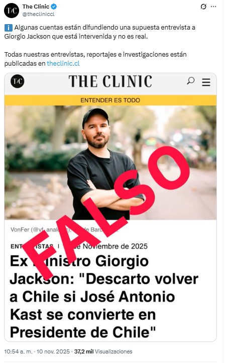 Con más de 100 mil visualizaciones, usuarios en X, Facebook e Instagram difundieron una supuesta entrevista concedida por el exministro de Desarrollo Social del gobierno de Gabriel Boric Giorgio Jackson al medio The Clinic, el pasado 10 de noviembre.