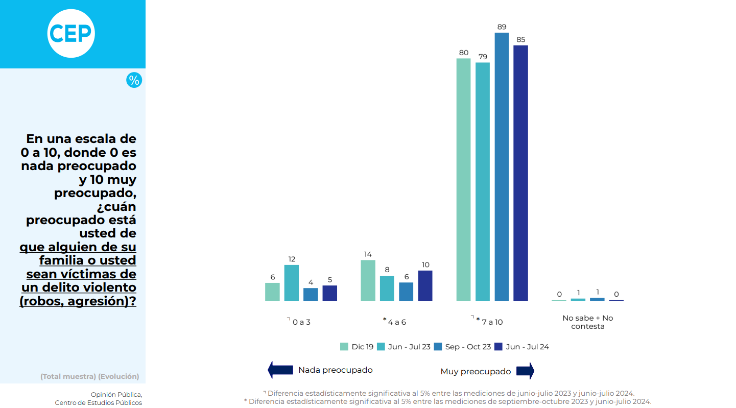 Otra de las pregunta fue "en una escala de 0 a 10, donde 0 es nada preocupado y 10 muy preocupado, ¿cuán preocupado está usted de que alguien de su familia o usted sean víctimas de un delito violento (robos, agresión)?".
