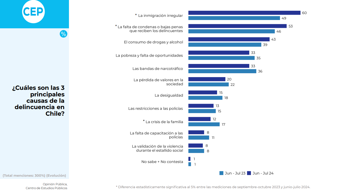 Una nueva encuesta del Centro de Estudios Públicos (CEP) mostró cuáles son las principales causas que las personas atribuyen a la delincuencia en Chile, según los resultados de su estudio.