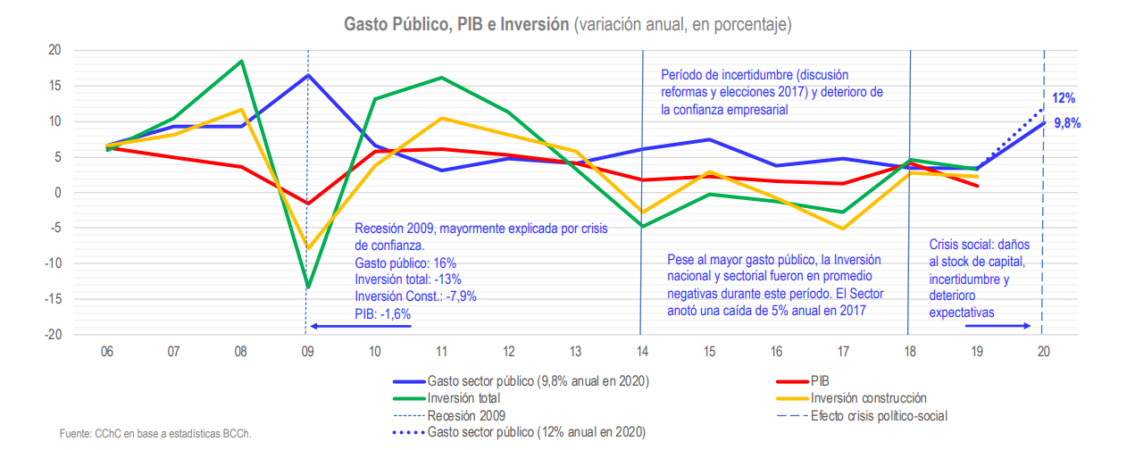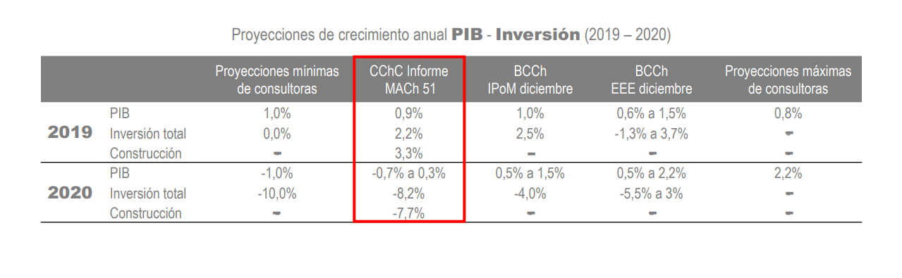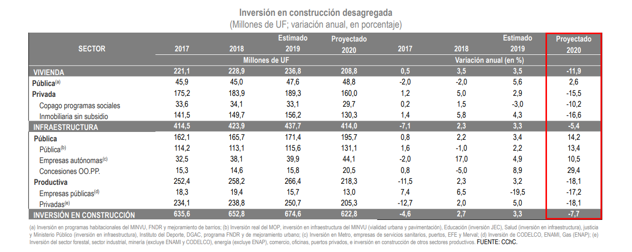 La Cámara Chilena de la Construcción elaboró un informe con proyecciones negativas ante el escenario para 2020 respecto de la evolución de la actividad del sector en ítems como infraestructura, vivienda y construcción, y que explican "en parte por los impactos sufridos por las empresas socias de la CChC post 18-O".