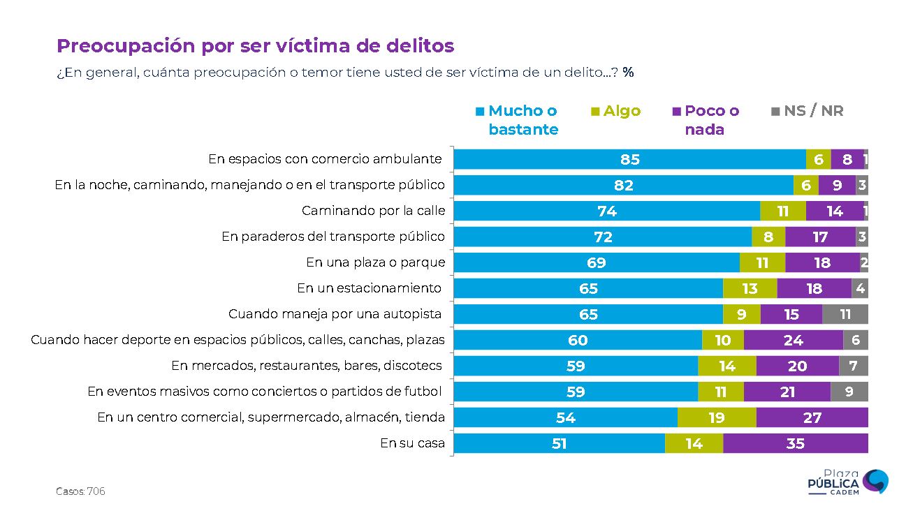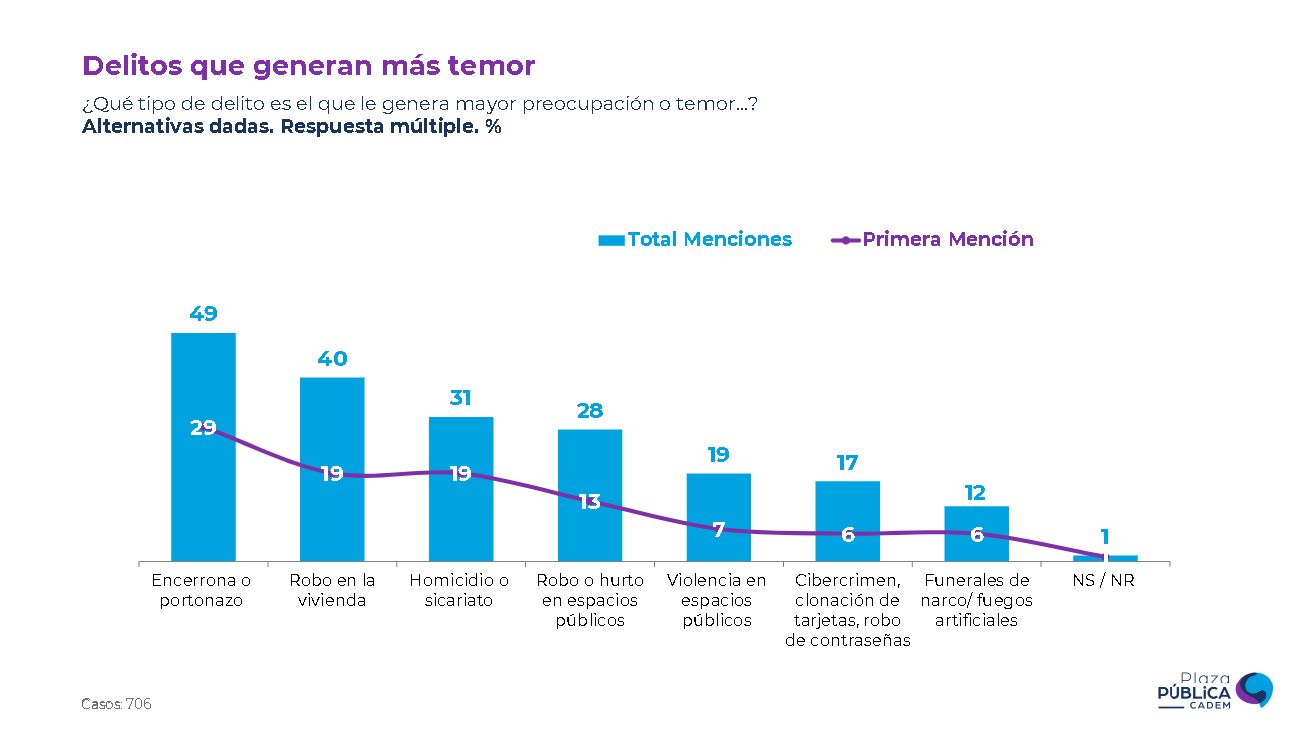 En cuanto a los delitos que producen más preocupación, están las encerronas o portonazos (49%), robo en la vivienda (40%) y homicidio o sicariato (31%).