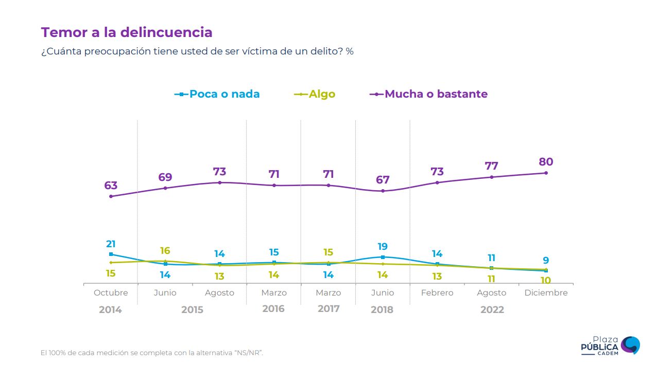 Además, un 87% de los encuestados considera que la delincuencia ha aumentado en el último año, seis puntos más que la medición de agosto pasado.