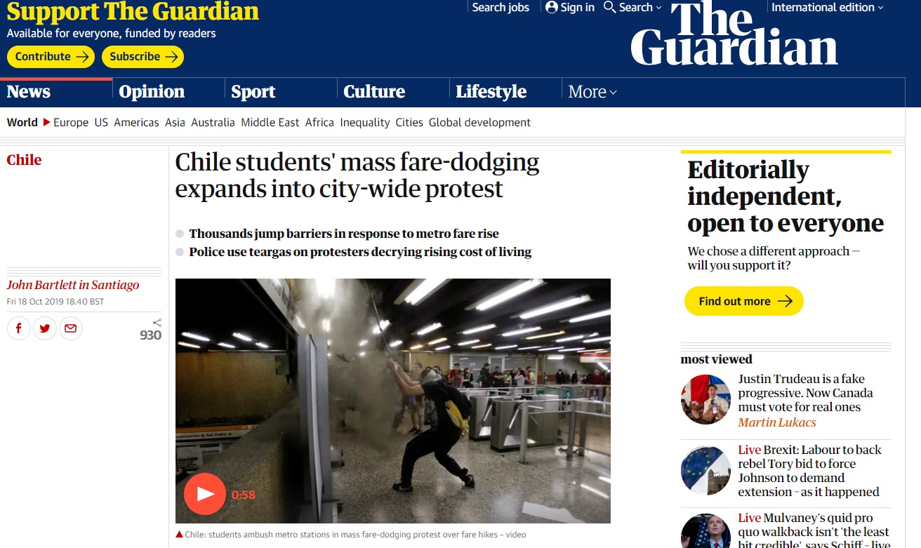 Este viernes The Guardian tituló "La evasión masiva de estudiantes de Chile se expande en una protesta en toda la ciudad".