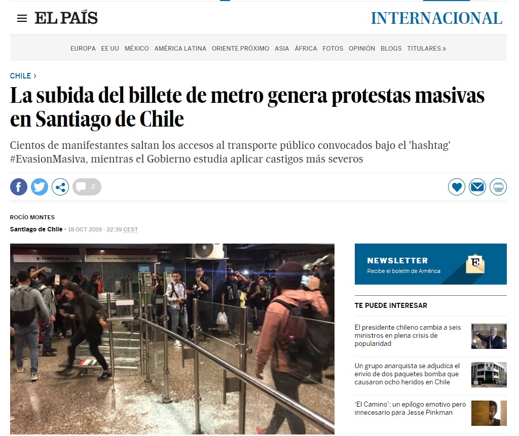 “Las protestas reflejan divisiones agudas en Chile, una de las naciones más ricas de América Latina, pero también una de las más desiguales”, señaló Reuters sobre las evasiones masivas.