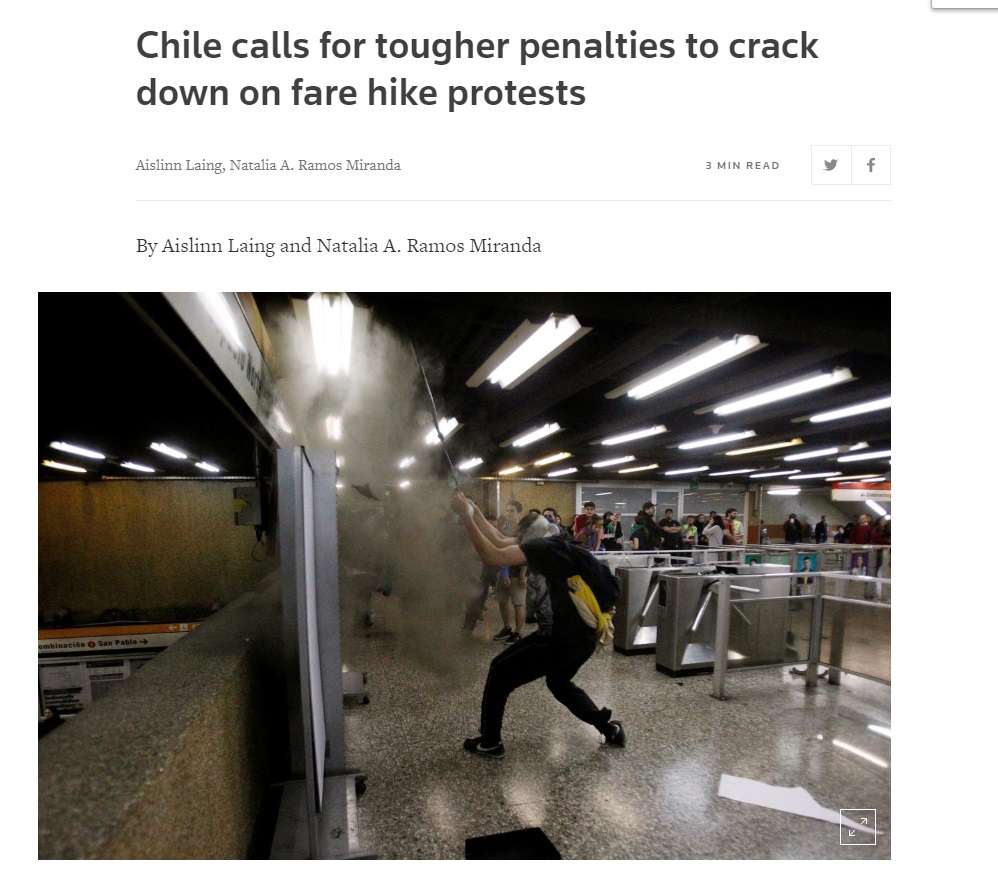 Finalmente, la agencia internacional de noticias Reuters tituló "Chile pide sanciones más severas para tomar medidas contra las protestas por el aumento de tarifas".